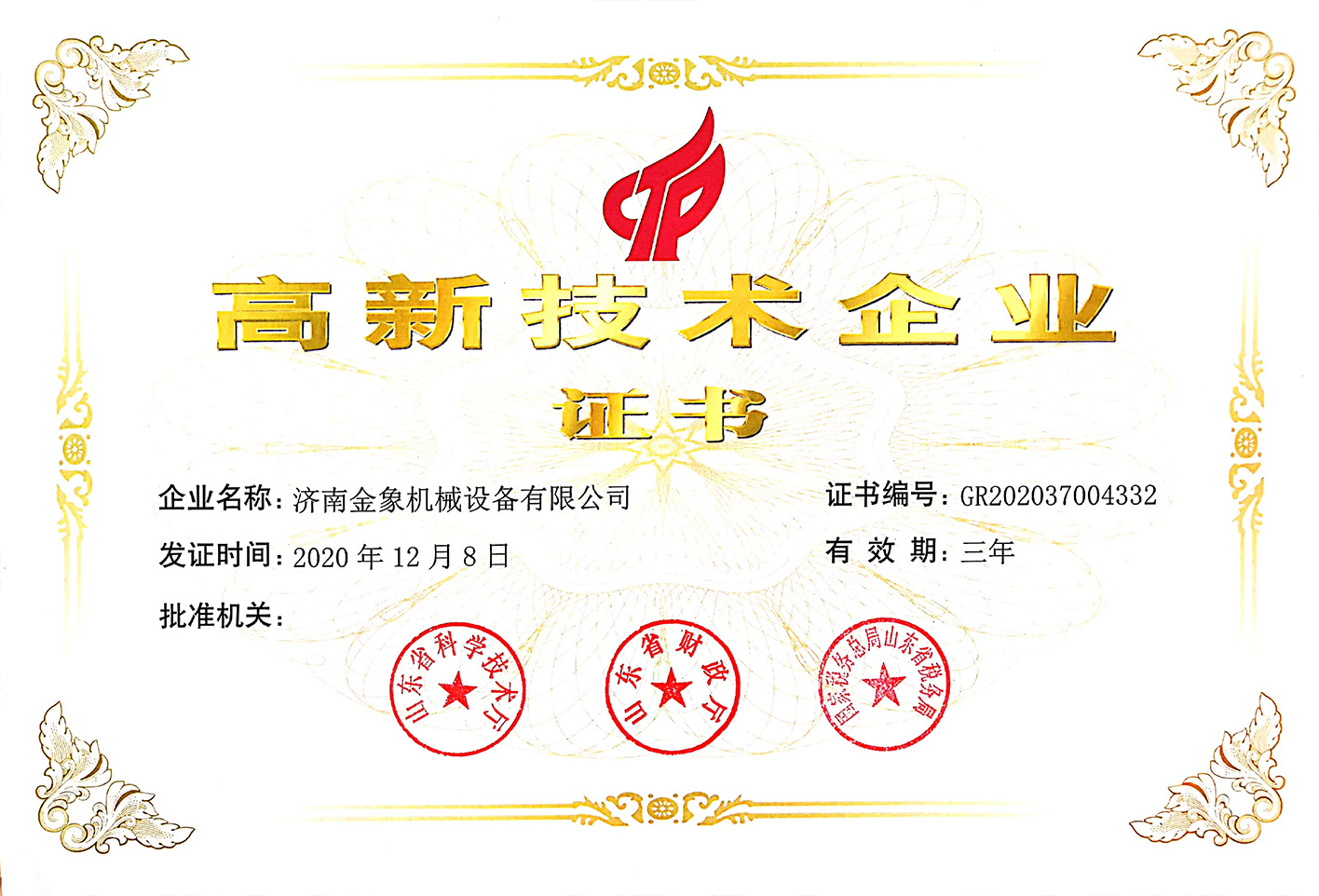 根據(jù)國(guó)家《高新技術(shù)企業(yè)認(rèn)定管理辦法》和《高新技術(shù)企業(yè)認(rèn)定管理工作指引》的相關(guān)規(guī)定,濟(jì)南金象機(jī)械設(shè)備有限公司被認(rèn)定為國(guó)家級(jí)高新技術(shù)企業(yè)。